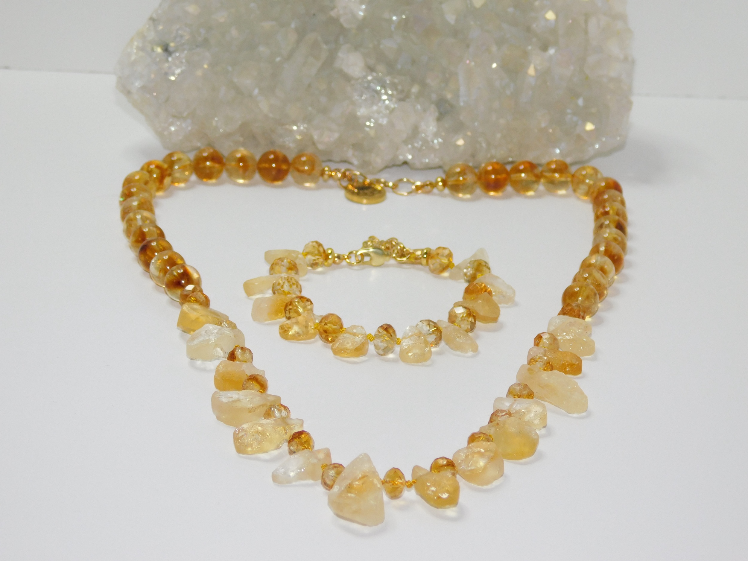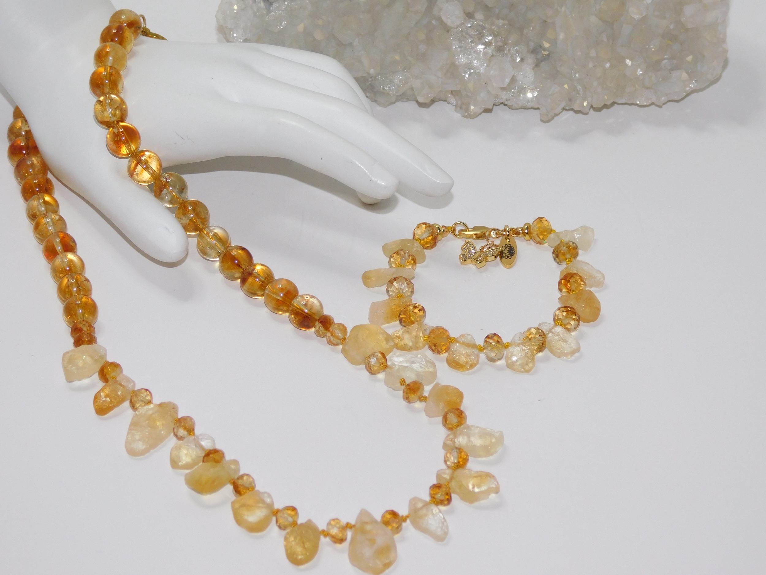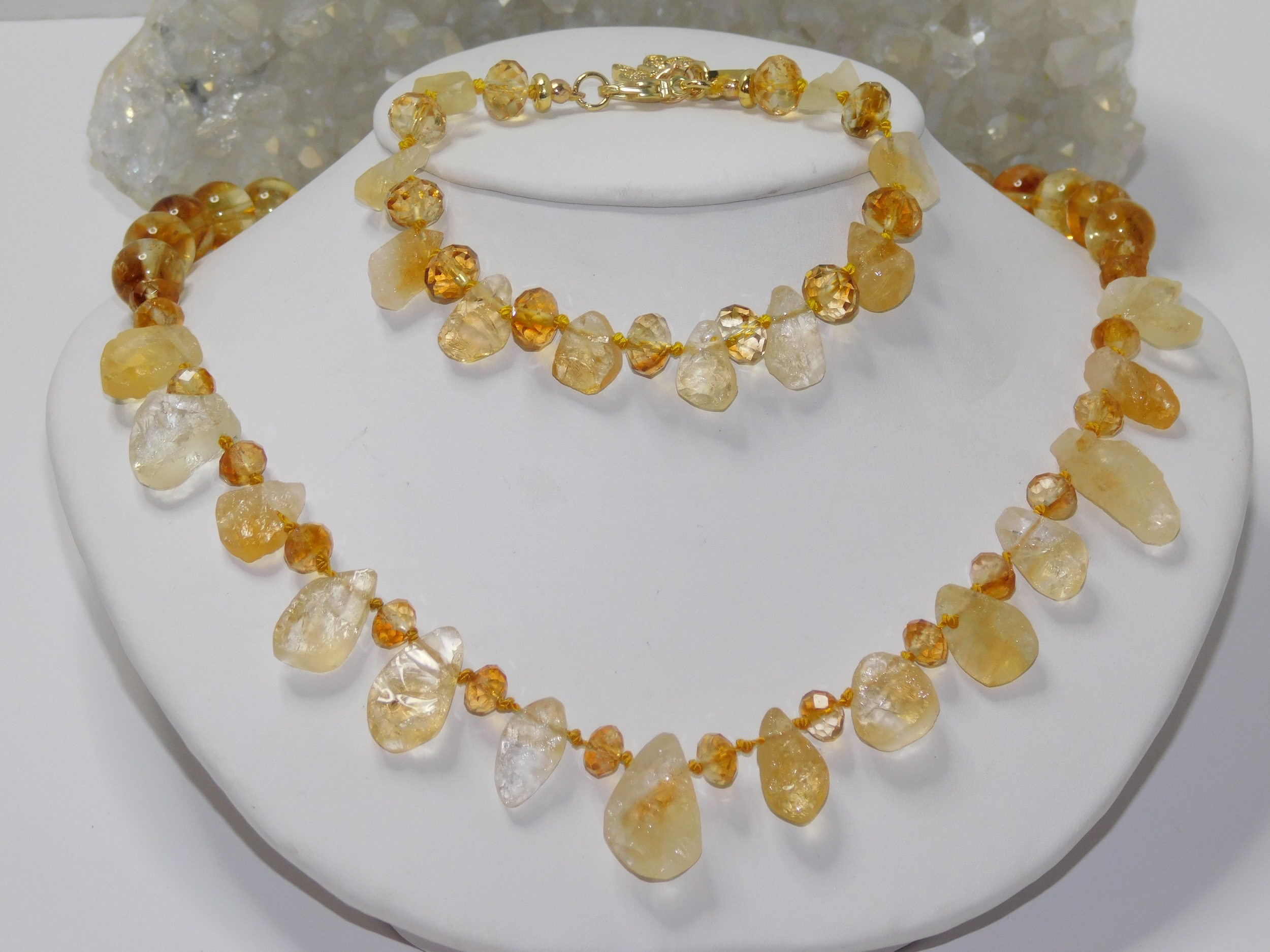 This Ladies Necklace & Bracelet Set uses Grade AAA Natural Faceted Graduated Ombre Citrine, Golden Polished Citrine Beads & Freeform Raw Petal Shape Citrine Nuggets.