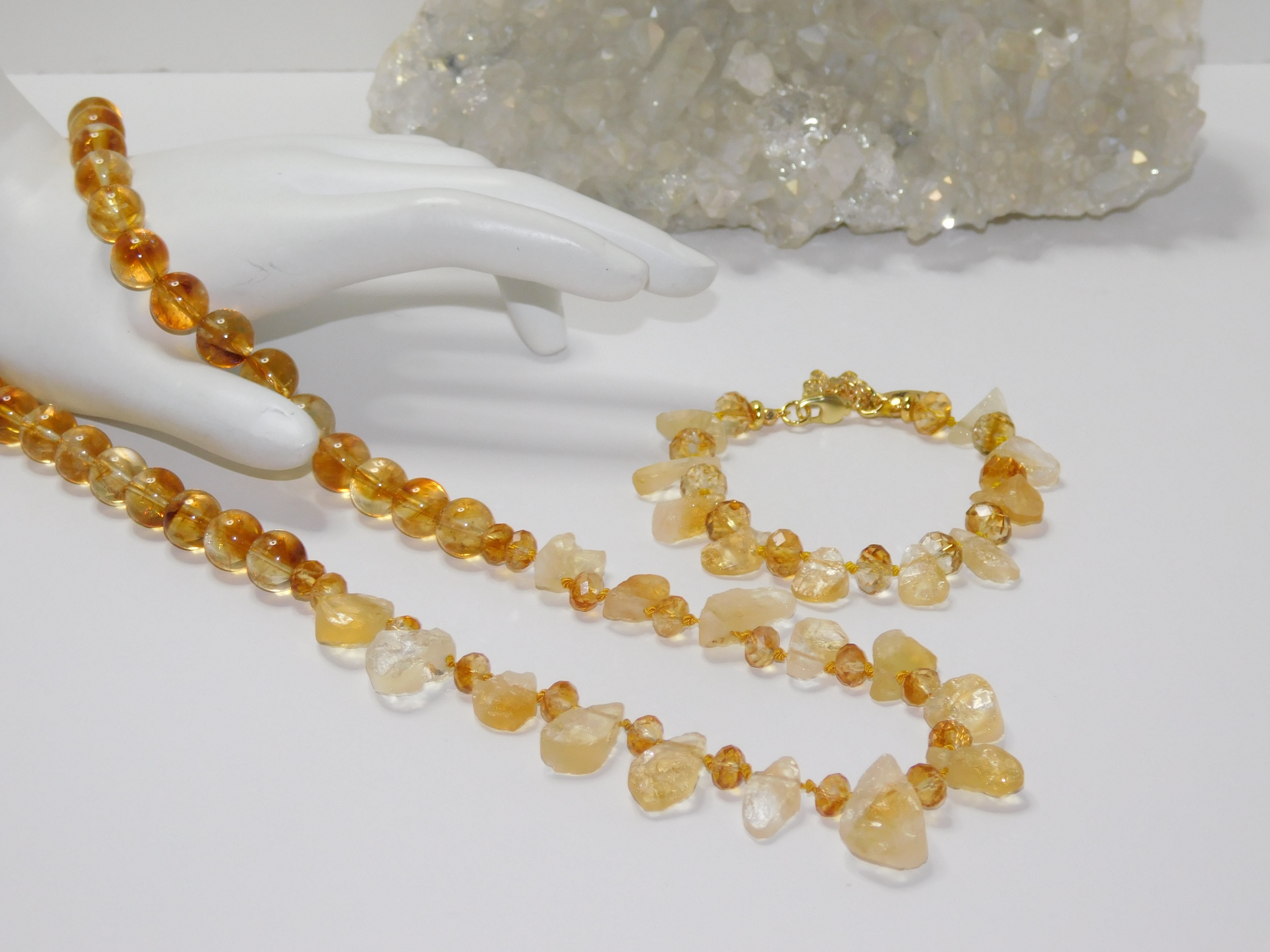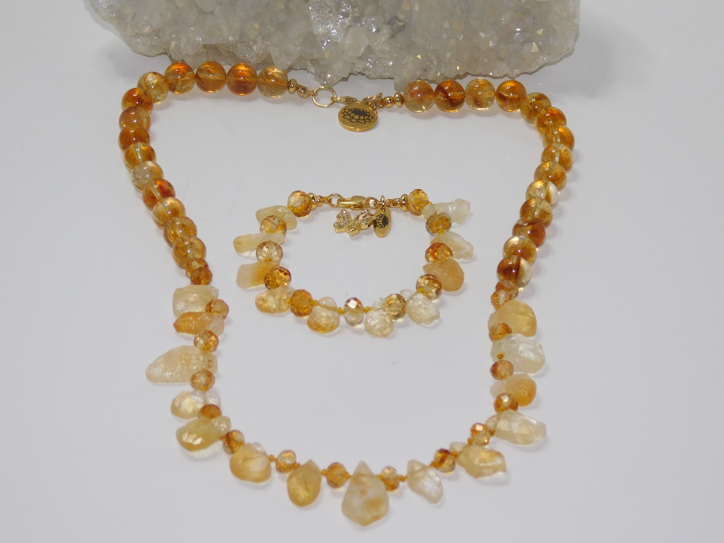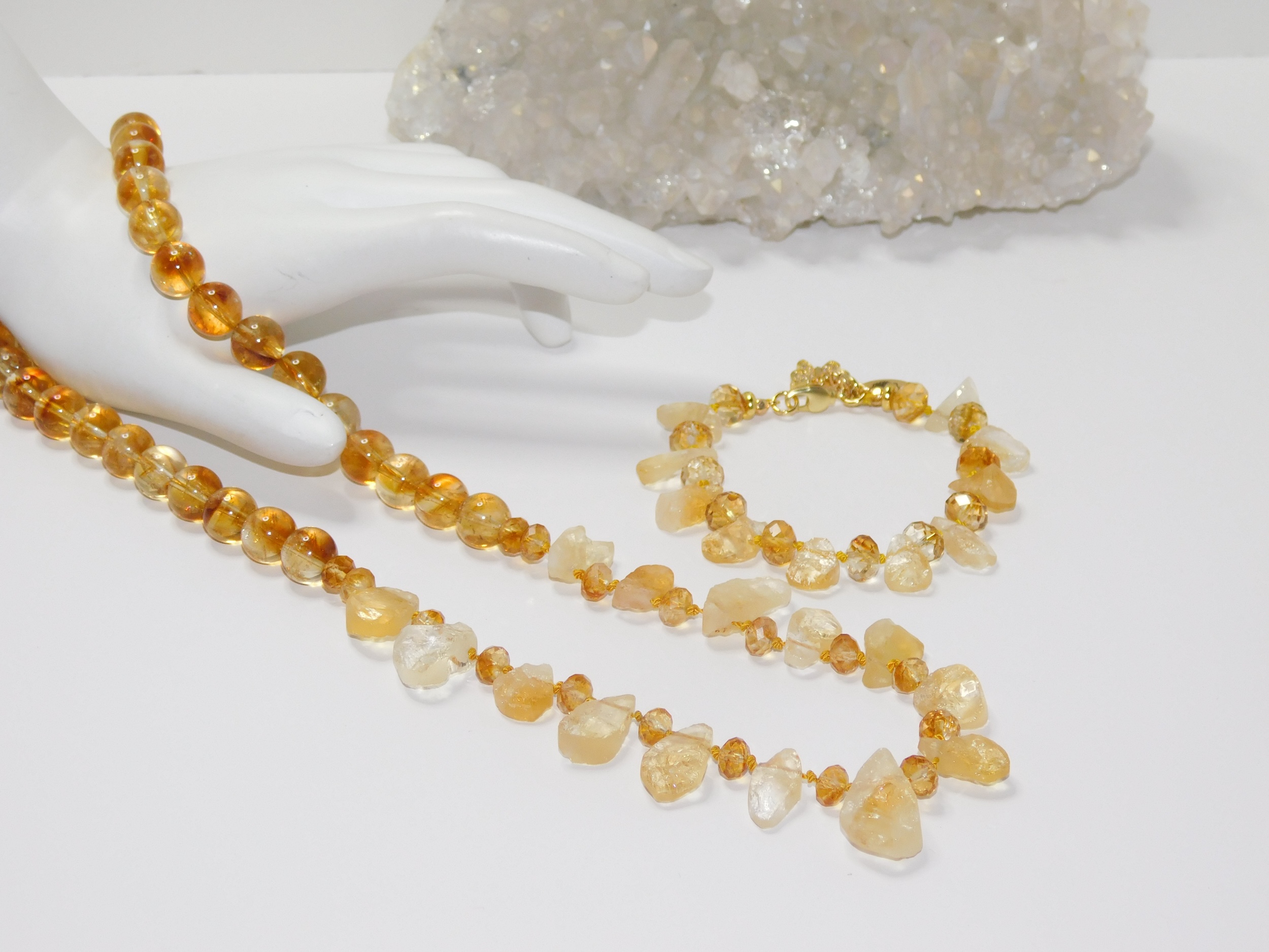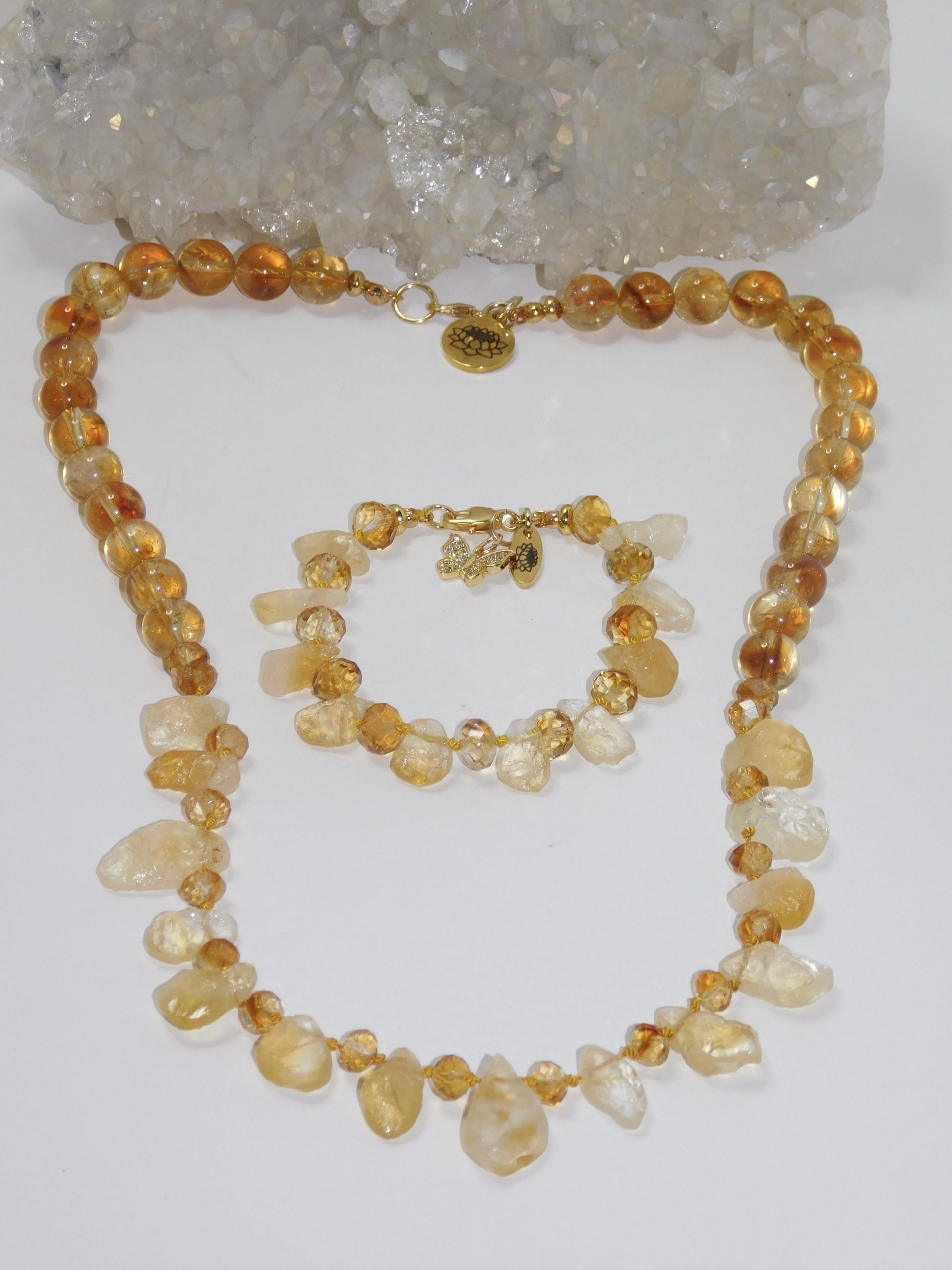 This Ladies Necklace & Bracelet Set uses Grade AAA Natural Faceted Graduated Ombre Citrine, Golden Polished Citrine Beads & Freeform Raw Petal Shape Citrine Nuggets.