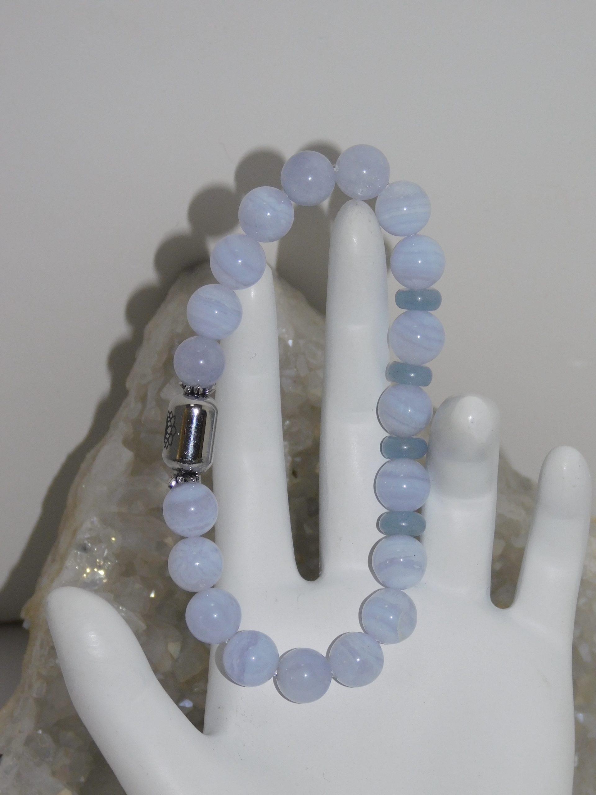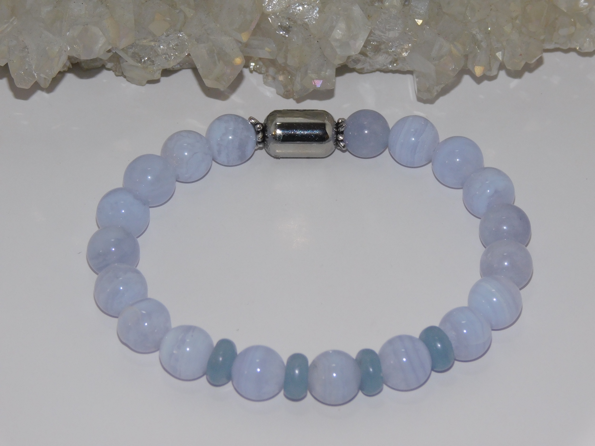 The Combination of Blue Lace Agate & Angelite is two stones that share a gentle, soothing energy that can promote peace & harmony, transparent and honest communication, forgiveness and compassion, reduce stress, and enhance spirituality, intuition, and emotional balance.  These Zodiac Signs can benefit from this soothing combination:  Gemini, Pisces, Aquarius, Cancer & Libra.