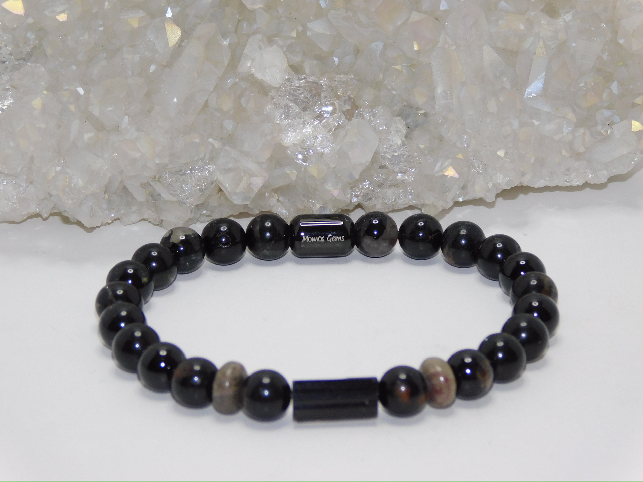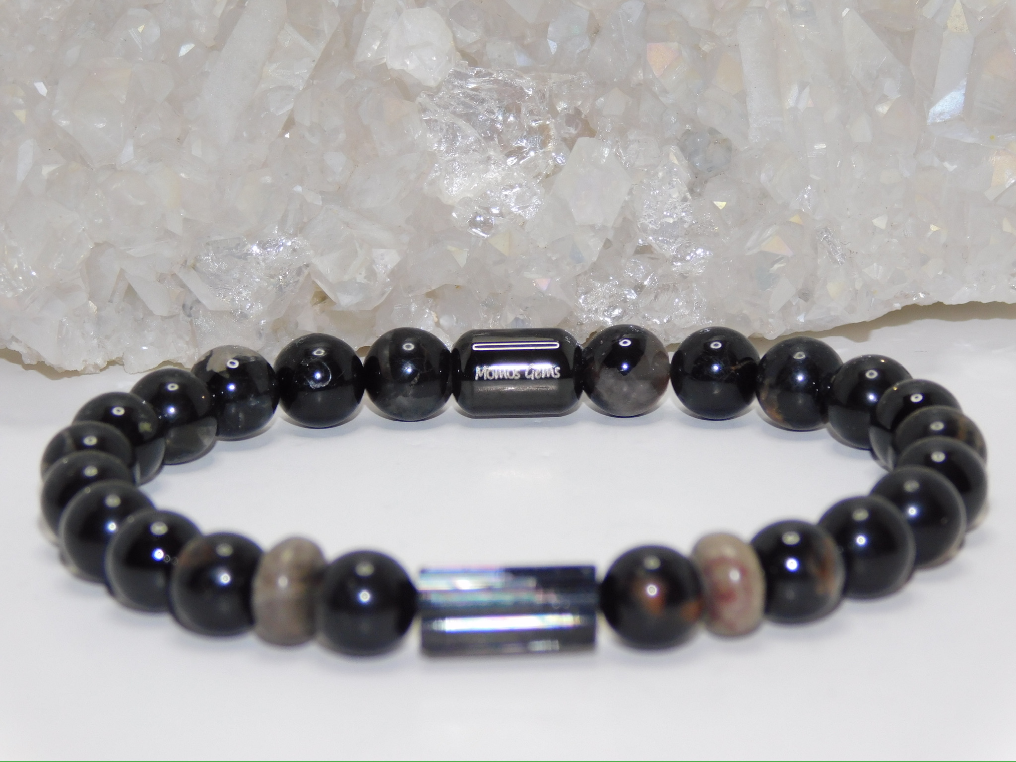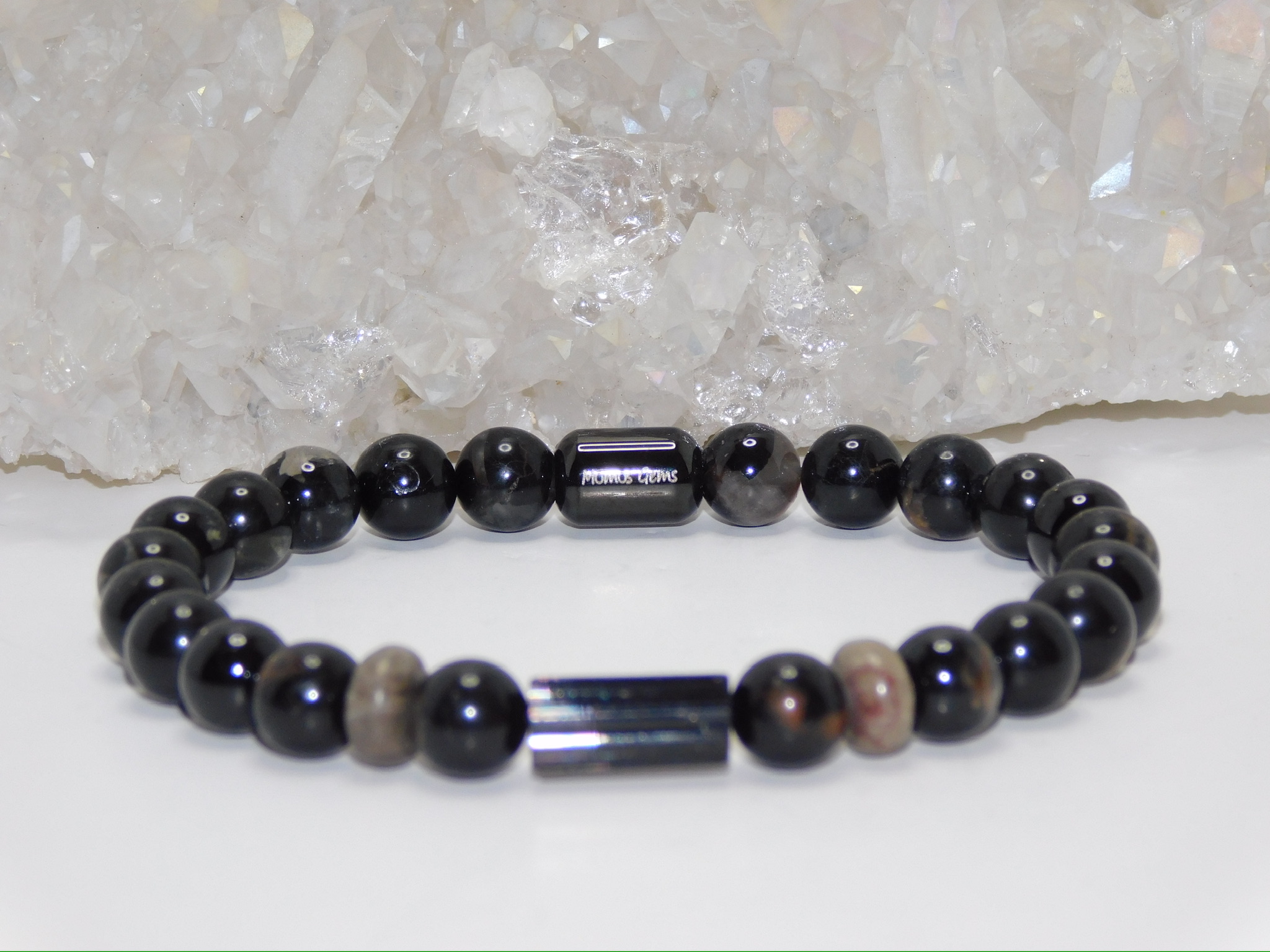 This Men Stretchy Bracelet uses Grade AAA Black Tourmaline Bar & Black Tourmaline with Red Quartz Matrix Beads & Petoskey Stone Rondelles.