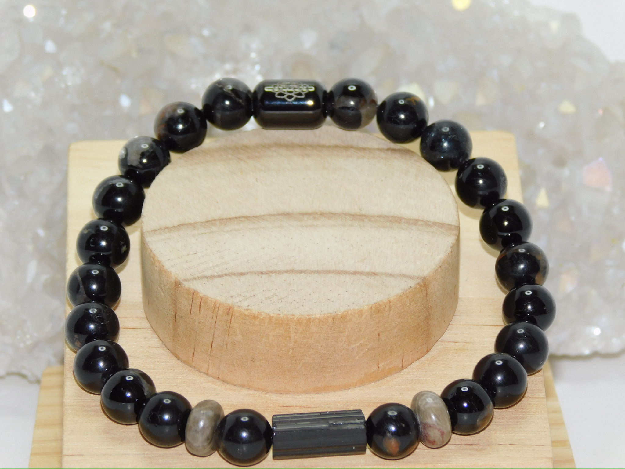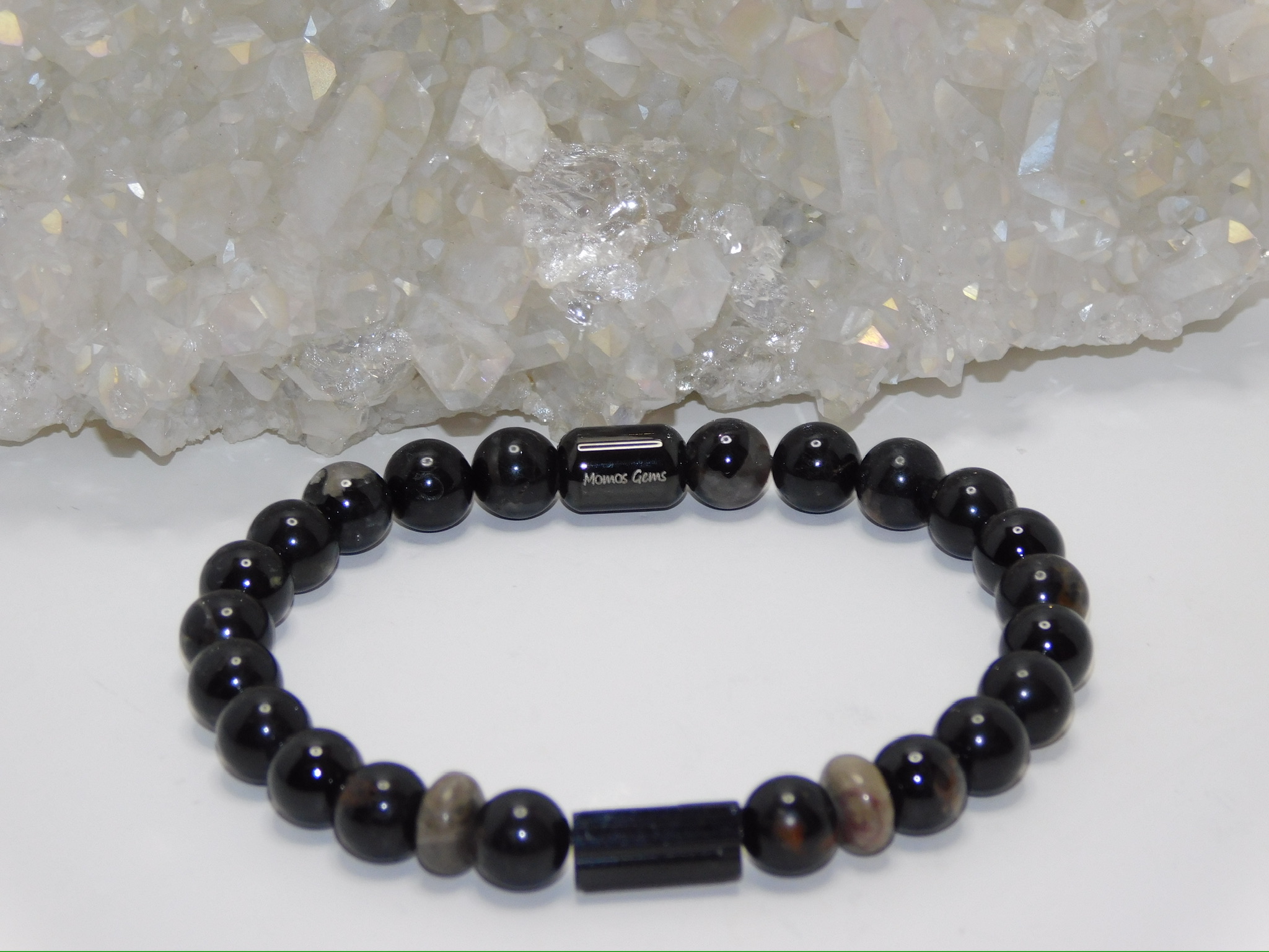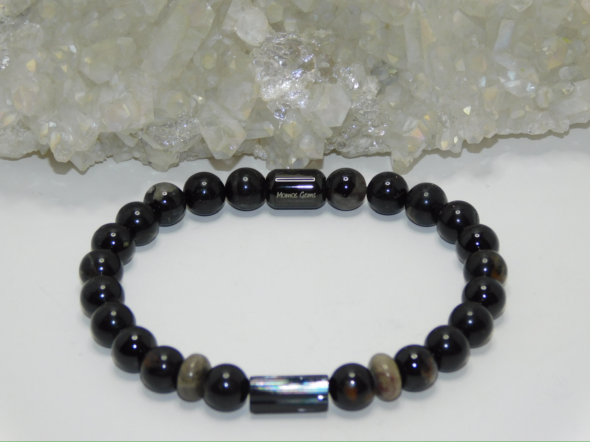 This Men Stretchy Bracelet uses Grade AAA Black Tourmaline Bar & Black Tourmaline with Red Quartz Matrix Beads & Petoskey Stone Rondelles.