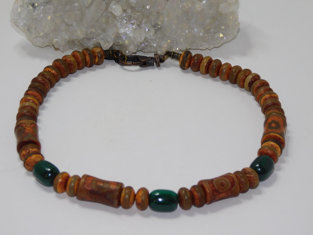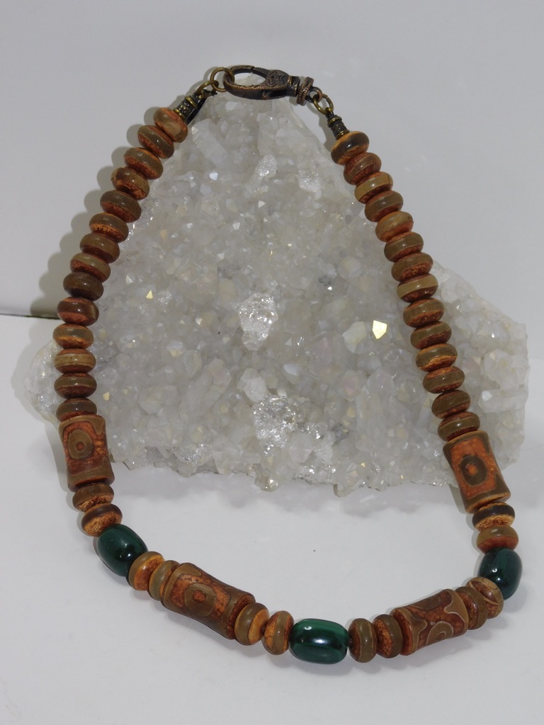This Men Necklace uses Tibetan Agate 3-Eye Dzi (Bamboo Style) with Malachite Nuggets.