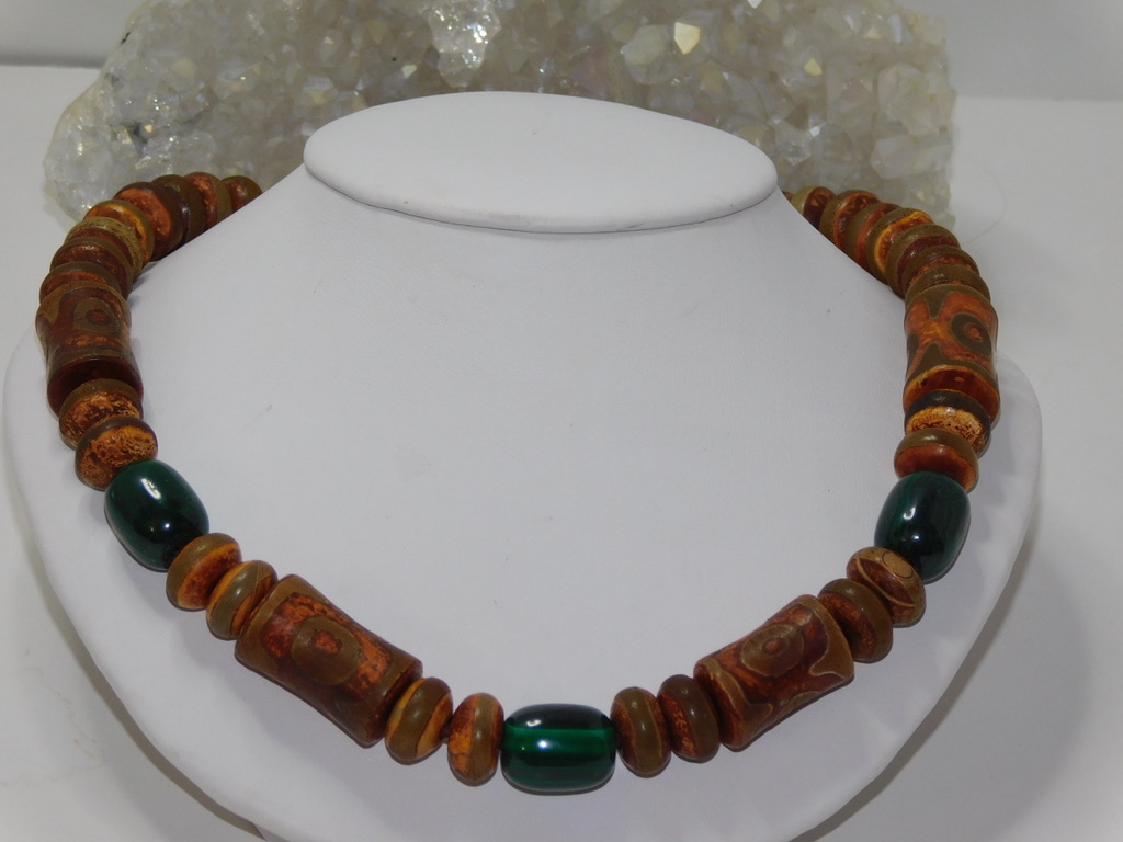 Tibetan Agate 3-Eye Dzi Bamboo Style & Malachite Men Necklace