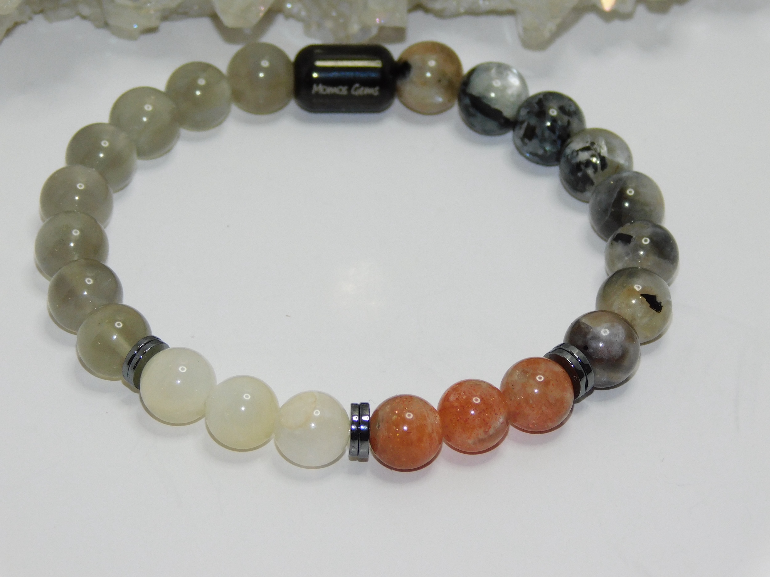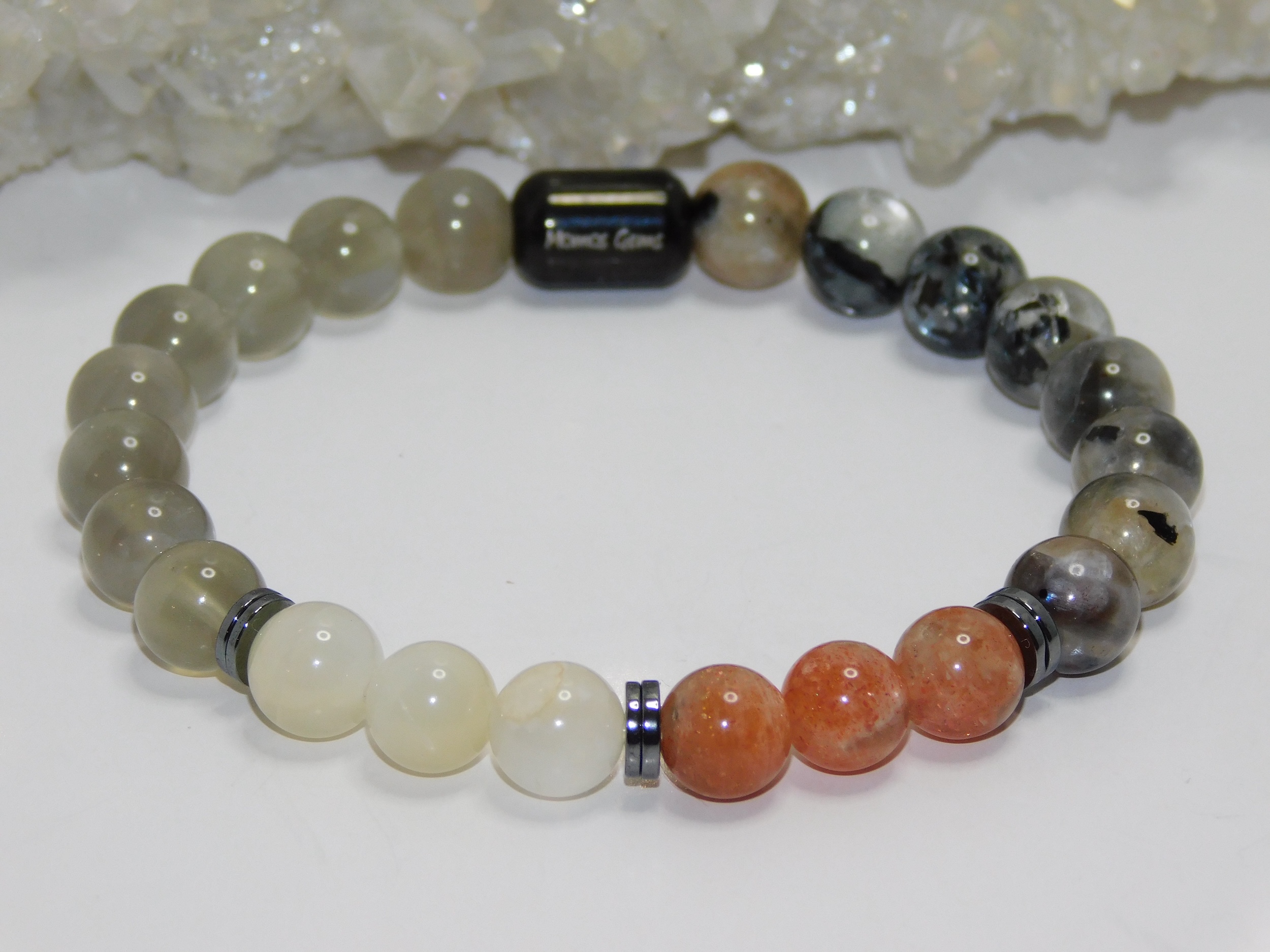 The integration of Hematite into this hybrid brings a remarkable grounding quality. Known for its ability to anchor the wearer, Hematite fortifies self-confidence and willpower, offering a sense of stability crucial when delving into the depths of one’s emotions and dreams. This grounding aspect is essential for manifesting desires into reality, as it helps translate those lofty aspirations into tangible actions. This hybrid stone radiates gentle but potent vibrational energies that inspire balance when worn or meditated upon. It encourages individuals to take inspired actions (thanks to Sunstone) while remaining connected to their intuitive side (a gift from Moonstone). The Hematite inclusions anchor, ensuring one dreams big and remains rooted in practical realities.