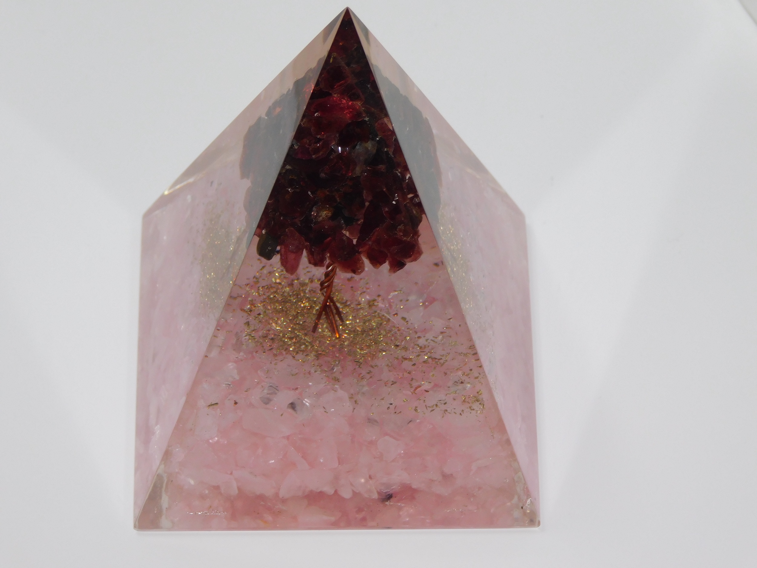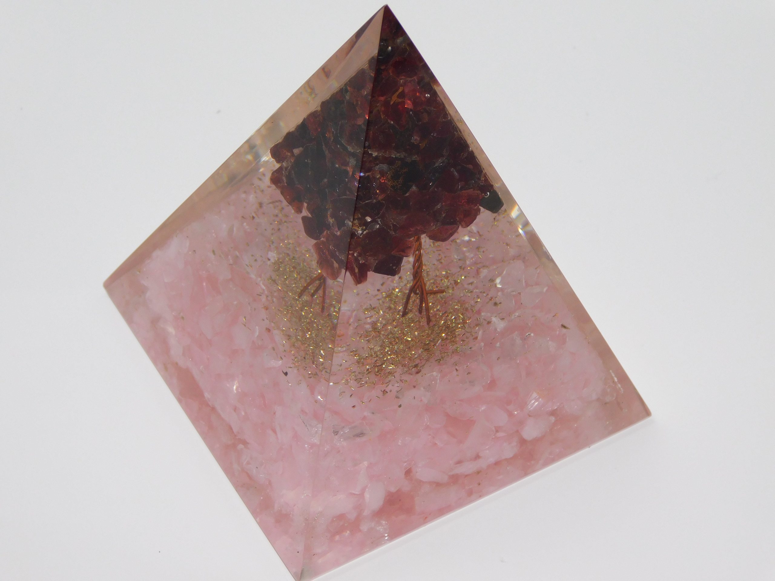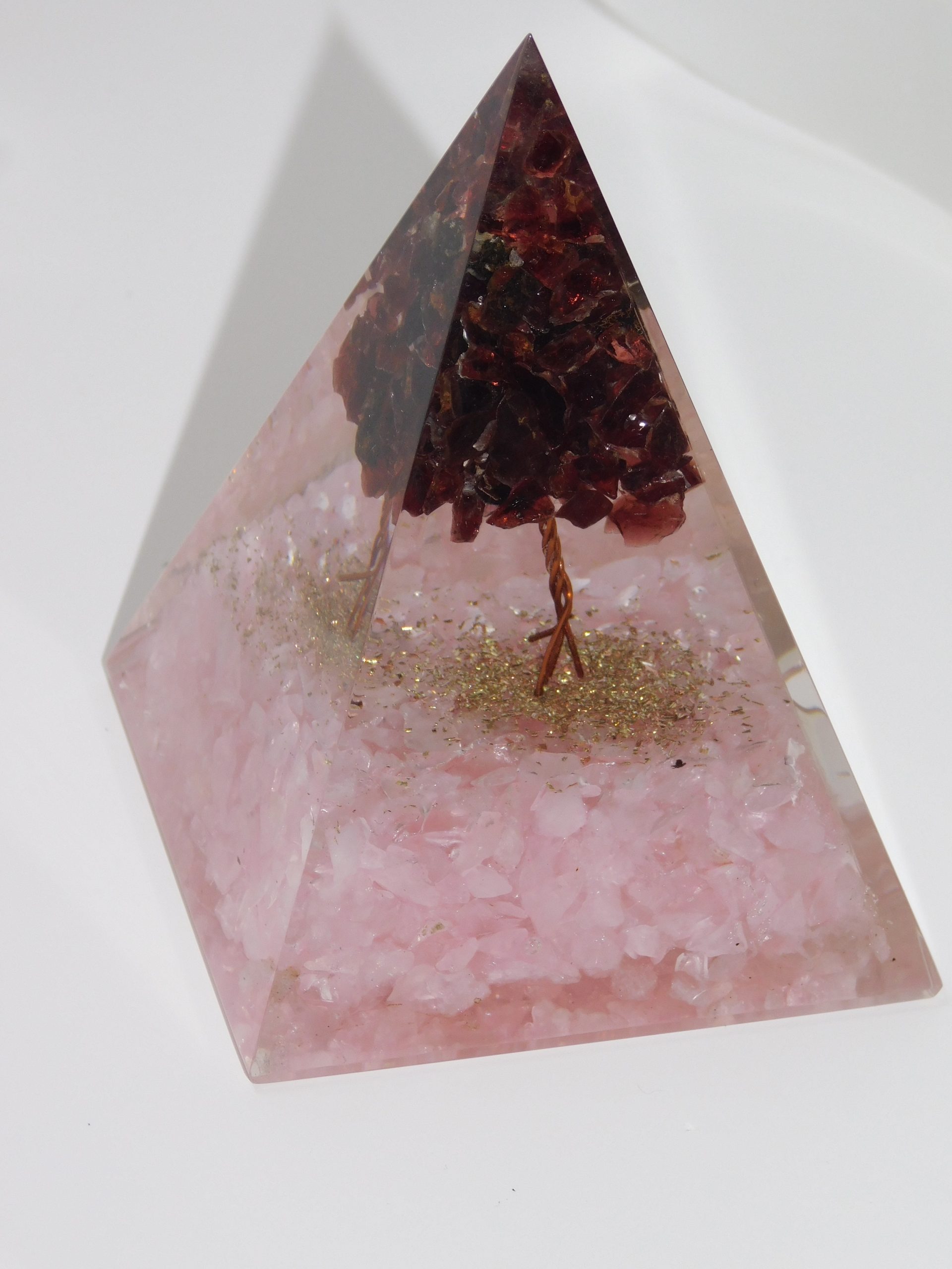 Orgone Pyramids help enhance healing energy, cleanse the aura, and facilitate meditation. This Orgone Pyramid contains Rose Quartz & RED Garnet, both Crystals that deal with matters of the heart and love. Both Crystals encourage self-forgiveness and acceptance. They both promote self-confidence and strength of character. Rose Quartz is a crystal of unconditional love and peace; while RED Garnet bestows its owner the courage and hope needed to face life’s challenges, it is also known to bring its owner much luck, wealth, and blessings. Use your Orgone Pyramid to meditate and infuse the pyramid with your energy and intentions.