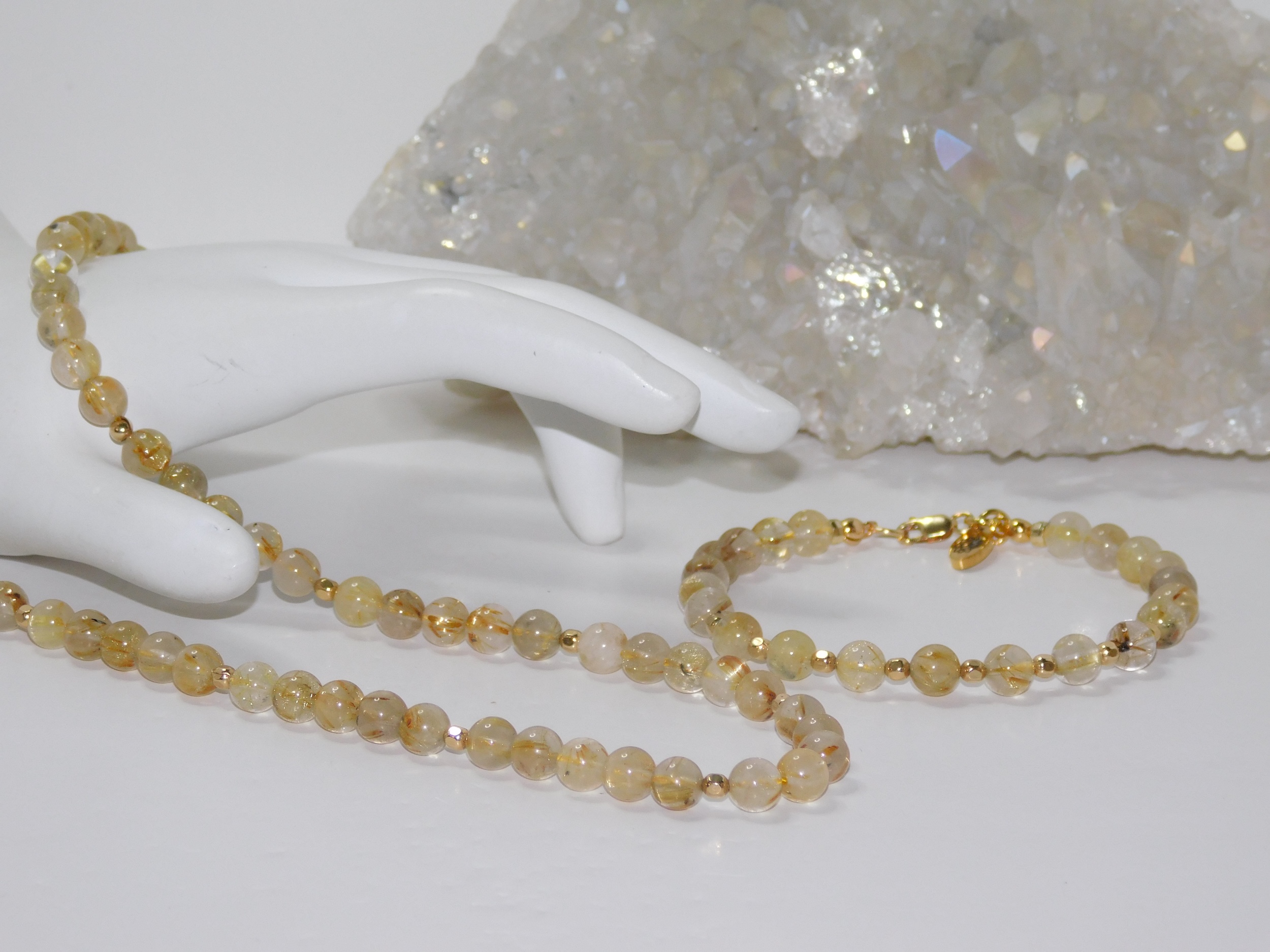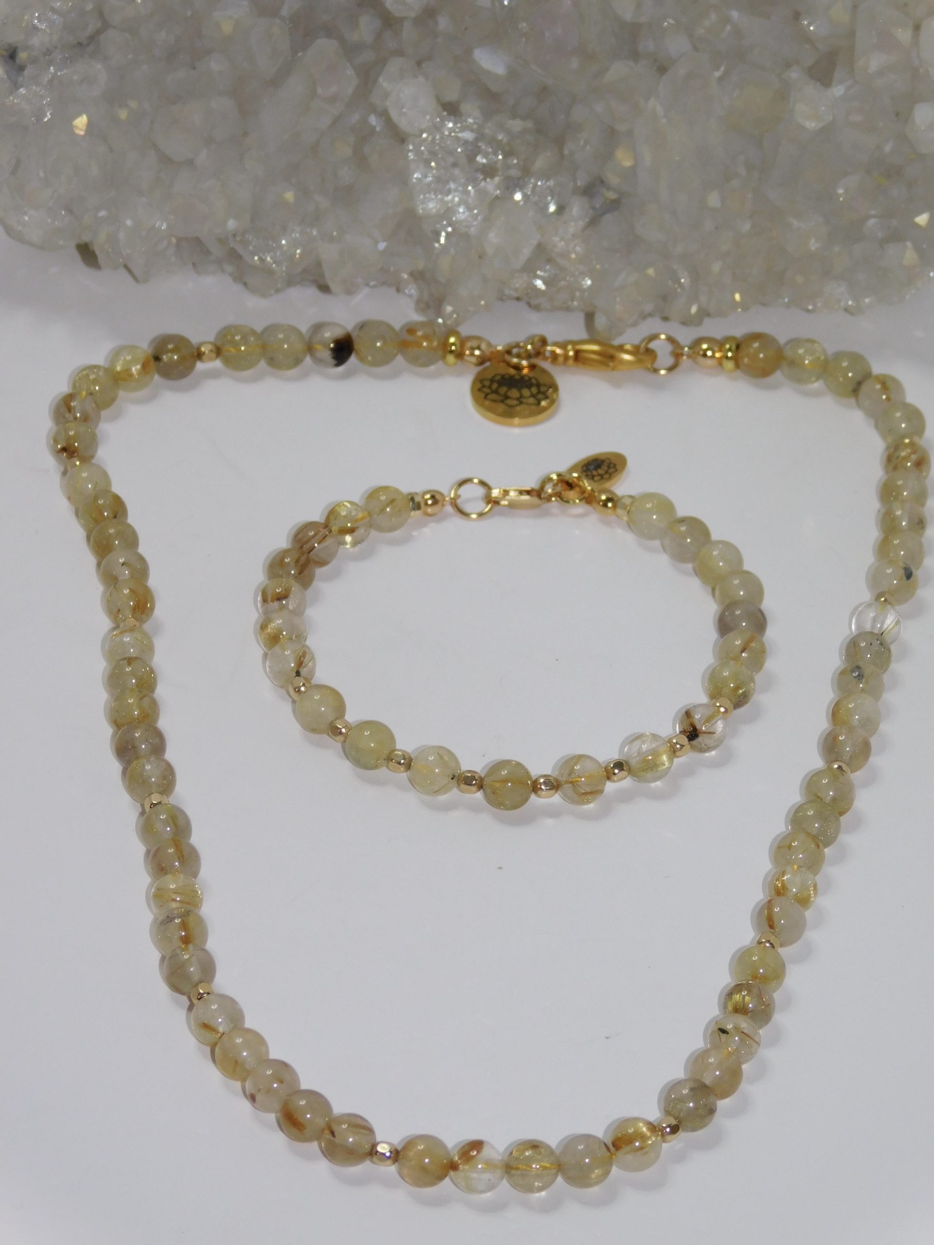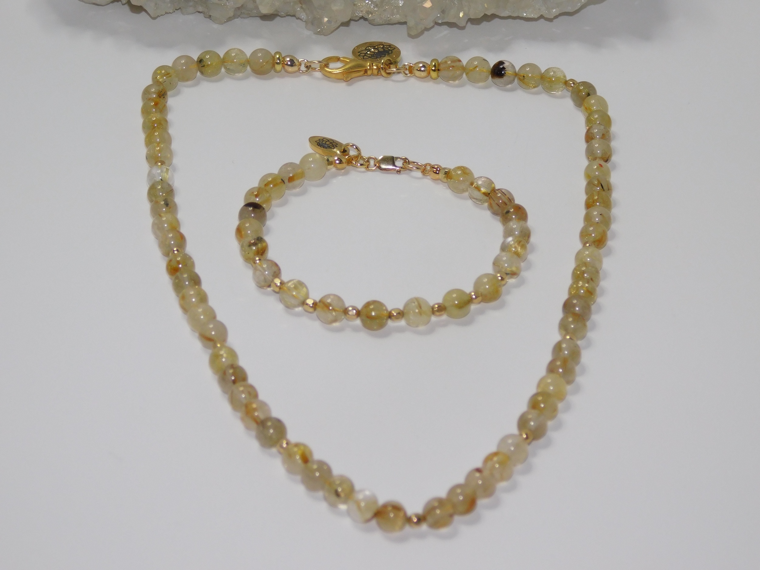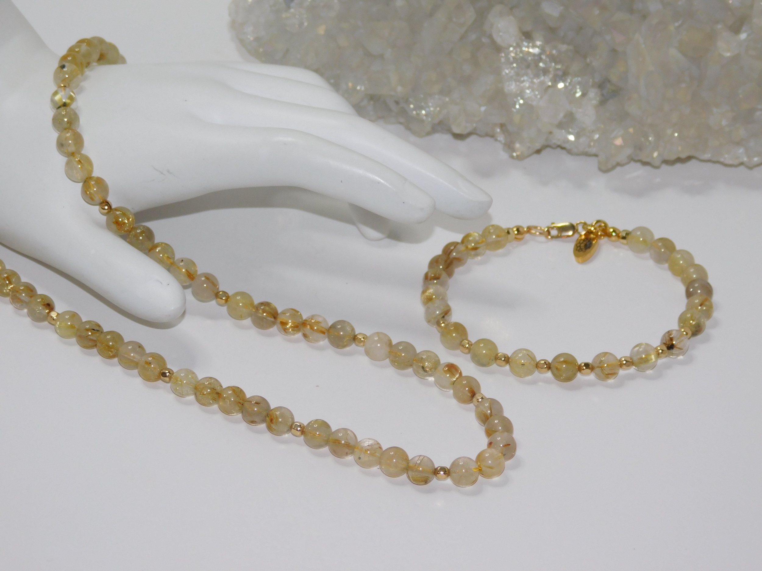 Metaphysical Properties of Golden Rutilated Quartz: The beads on the bracelet occasionally contain Hematite inclusions. This is a mesmerizing gemstone within the quartz mineral group, renowned for its unique beauty and compelling characteristics. This captivating stone primarily comprises silicon dioxide, its foundational structure, but the striking titanium dioxide inclusions set it apart. These golden threads of rutile weave through the crystal, resembling delicate gold filaments that catch the light, creating a stunning visual display. The interplay of clear quartz and golden rutile adds beauty and metaphysical significance. On an esoteric level, Golden Rutilated Quartz is often regarded as a powerful ally for those seeking stronger intuition and spiritual awareness. It is believed to facilitate a more powerful connection with the spiritual realm, making it an excellent tool for meditation and introspection. The presence of this gemstone can amplify one’s thoughts and intentions, helping to manifest desires and aspirations more effectively. It is thought to provide clarity of mind, allowing individuals to align their intentions with their actions and guiding them towards their true purpose. Golden Rutilated Quartz is also celebrated for its association with luck, abundance, and prosperity. Many are drawn to this gemstone for its reputation as a charm that attracts positive energies and opportunities. Its warm, golden hues evoke optimism and joy, instilling confidence in one’s journey toward achieving goals. (Grammarly AI, 2025)